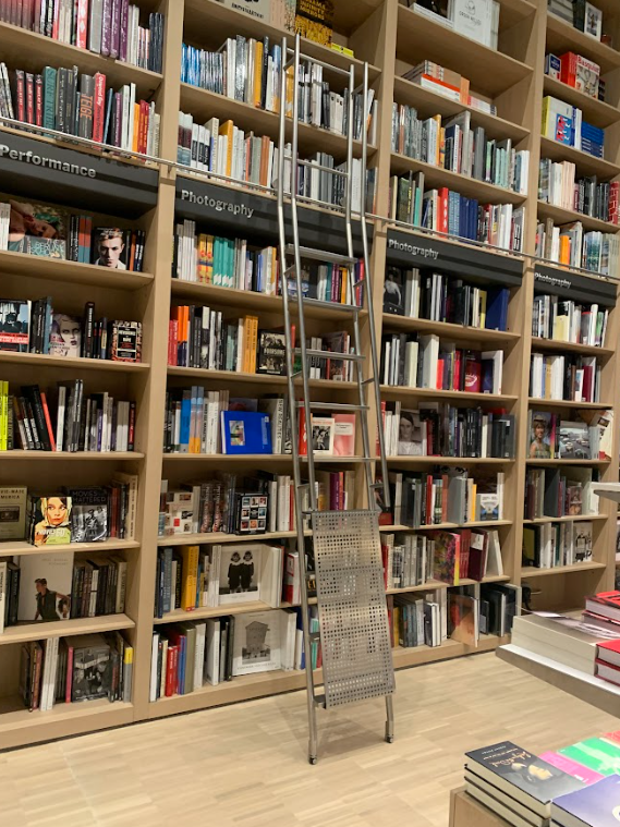 SL.6002.KL sliding ladder is prominently showcased in this museum gift shop. The custom cover over the bottom 4 steps was created detract customers while providing a beautiful design and quick access by staff to upper shelves. (shown with flat stainless steel steps, custom safety side rails, incl. base wheels)